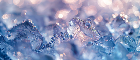 A close-up of ice cubes, glowing in vibrant shades of blue and purple with hints of pink and white, creating an otherworldly atmosphere. The colors create a dreamy effect as they reflect off the icy surface, adding depth to the scene. Soft lighting highlights their intricate textures, while subtle water droplets add a touch of realism. This image is perfect for conveying coolness or beauty associated with frozen drinks or food items. --ar 53:30 --v 6.1 Job ID: ec875935-3794-48fc-aebc-fc32686dcde1