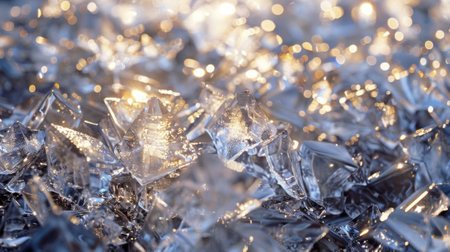 A mesmerizing close-up of ice crystals, showcasing their intricate shapes and vibrant colors as they reflect the enchanting light in a winter wonderland.