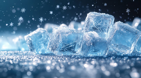 A group of melting ice cubes with frost and condensation, creating a fresh, cool effect that feels refreshing.