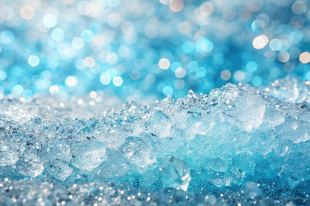 A close-up view of crystal clear ice showcasing intricate patterns and beautiful reflections. The bright blue tones and bokeh enhance the tranquil atmosphere.