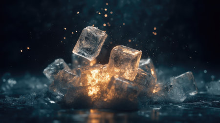 A visually striking arrangement of shimmering ice cubes stacked gracefully against a softly lit, dark background, creating a captivating atmosphere.
