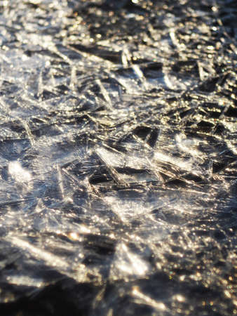 Close up of pieces of ice on frozen lake or river. Shatters of cracked ice closeup. Broken ice on the lake. Winter background.