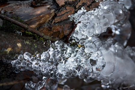 Pine-shaped ice growths at the stream in winter. Abstract ice background