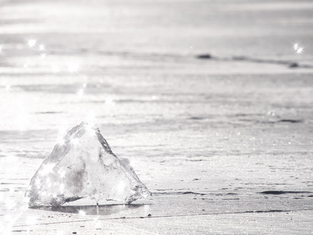 Piece of ice on a frozen lake under winter sun. Small depth of sharpness