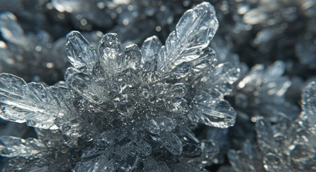 Closeup of frozen ice glistening in the sun outdoors in winter against blue background