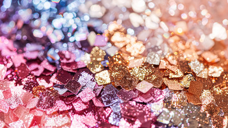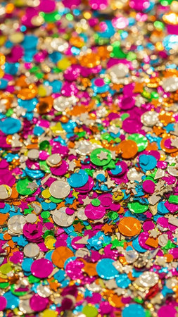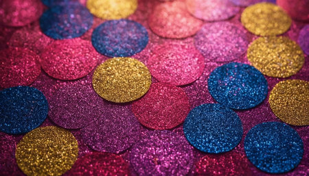 Birthday showing a close up macro of a vibrant and colorful collection of small metallic confetti pieces including circles stars and discs in bright pink blue...