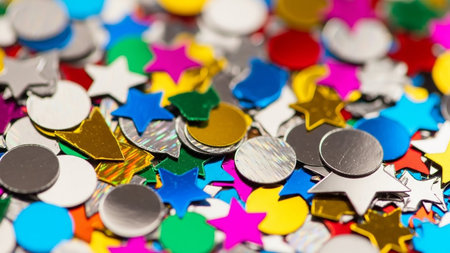 Stars showing close-up of a pile of colorful confetti and glitter shapes including stars circles and geometric forms in various bright metallic hues.