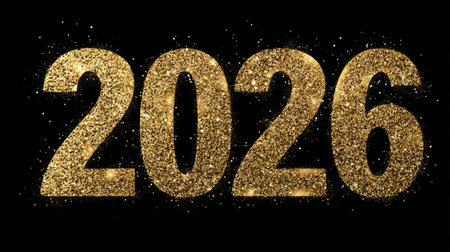 Golden glittery numbers form the year 2026 against a black background, creating a festive atmosphere for upcoming celebrations. This visual represents new beginnings and hope.