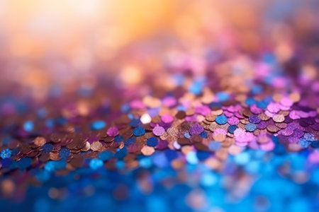 Macro shot of shiny confetti with bokeh as background. Generative AI