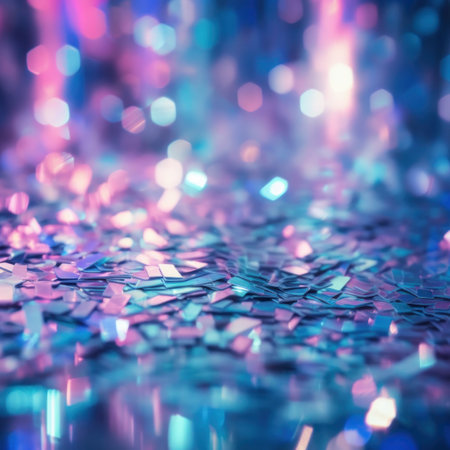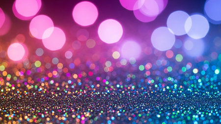 A soft focus background of colorful glitter with bokeh lights in shades of pink, blue, and purple. Clear details and vibrant colors enhance visual appeal.