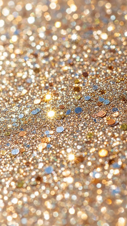Detail showing sparkling silver and gold glitter bokeh with starburst light effects and soft focus circles creating a and celebratory ambiance keywords: glitter,...