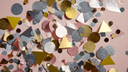 Festive confetti in gold, silver, and pink colors on a soft pink backdrop, perfect for celebrations and events.