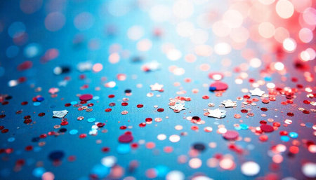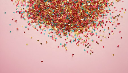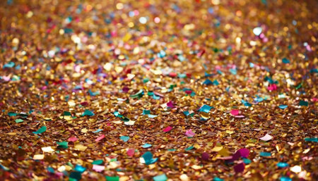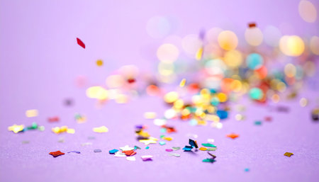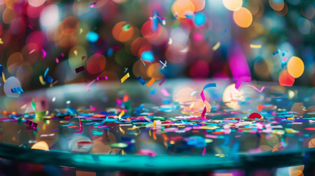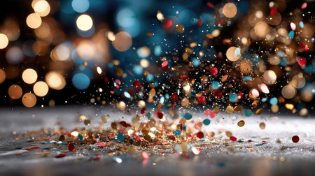 Captivating image of colorful glitter and confetti bursting on a surface, enhanced by a shimmering bokeh background, perfect for celebrating special moments.