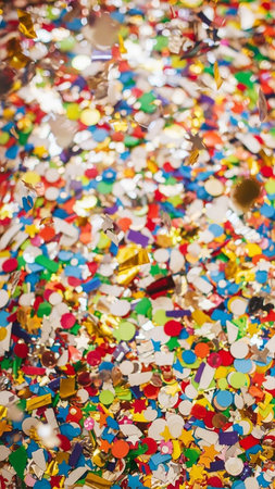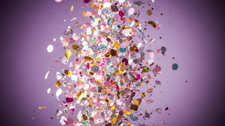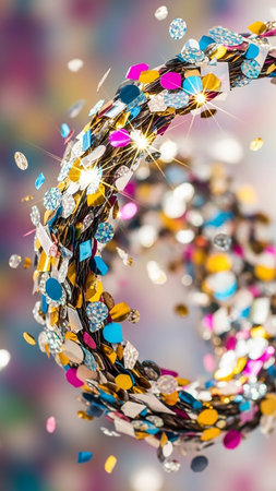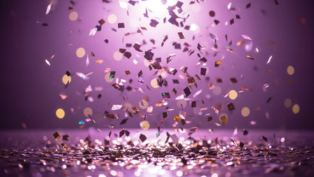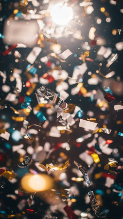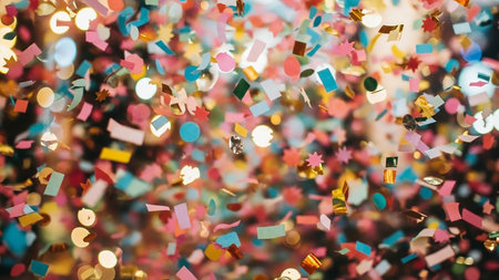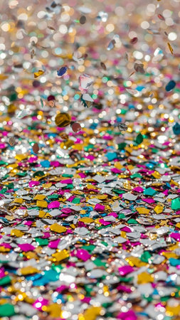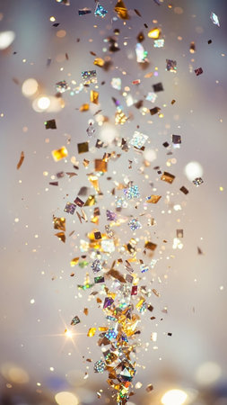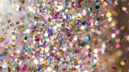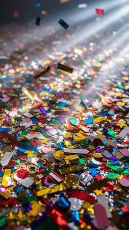 A vibrant cascade of colorful confetti and shimmering glitter falls and swirls in mid-air, illuminated by a bright, luminous light source creating a dynamic,...