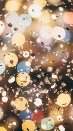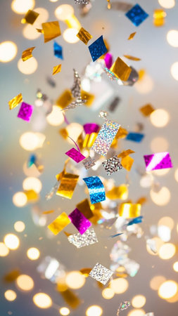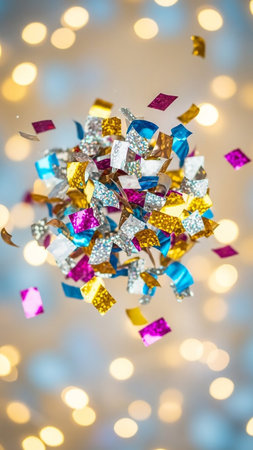 A dazzling burst of confetti fills the air, illuminated by vibrant bokeh lights. The joyful atmosphere evokes a sense of celebration, perfect for parties and special occasions.