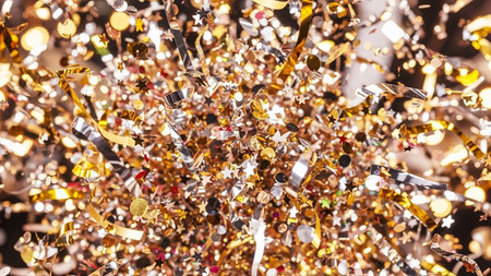 Explosion showing explosion of shimmering gold silver and copper confetti and streamers in mid-air against a blurred bokeh background creating a dynamic and...