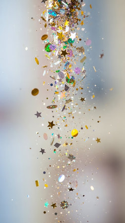 Bright showing a dynamic cascade of colorful glitter confetti and star shapes falling in a vertical stream against a soft, blurred background creating a festive and...