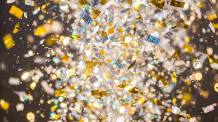 A dynamic abstract background filled with scattered golden and silver confetti and soft, glowing bokeh lights, creating a festive and celebratory atmosphere.