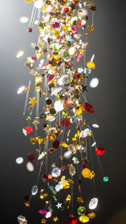 Strands showing cascading strands of shimmering metallic confetti in various shapes including circles and stars falling against a dark background keywords:...