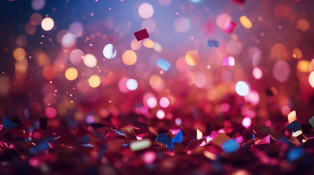 A close-up view of scattered confetti pieces interspersed with soft, blurry bokeh lights creates a vibrant and energetic festive party atmosphere.