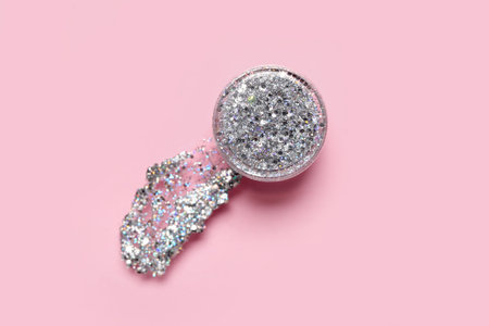Jar of silver glitter with stroke on pink background, closeup