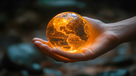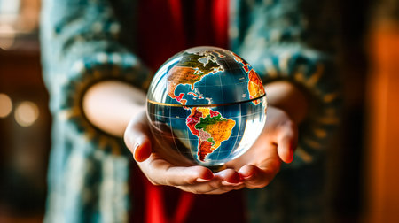 A young girl delicately holds a glass globe in her hands, symbolizing care, responsibility, and environmental consciousness.