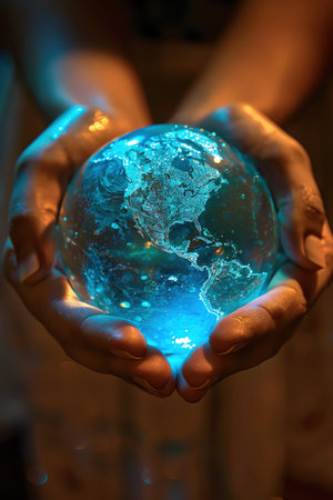 A human hand gently cradles a transparent, glowing blue globe, showcasing illuminated digital continents and intricate network lines across its surface.