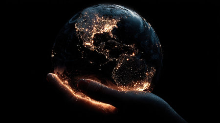 A digital composite features a luminous Earth globe held within a silhouetted hand, set against a dark backdrop. The planet displays vibrant city lights, contrasting with the hand's soft glow. This visual represents a concept of care or stewardship, suitable for science, technology, or environmental themes, potentially for advertising or editorial use.