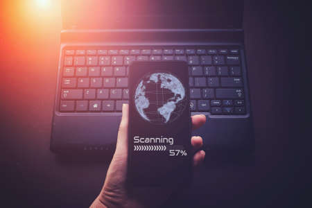 Female hands using smart phone, smart phone with Virtual gologram of digital globe and notebook computer. Mock up. Concept Global network. Business Growth concept. Working from home.