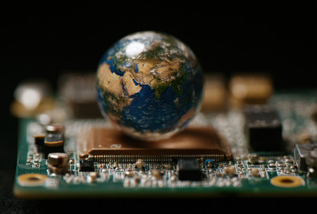 Miniature Earth globe rests atop a detailed computer circuit board, symbolizing technology's impact