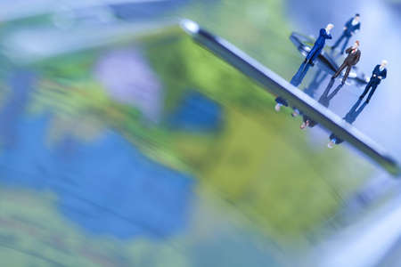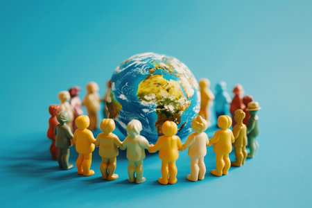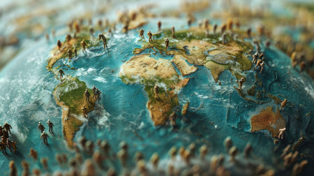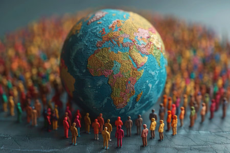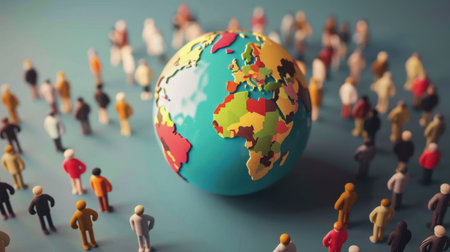 This image shows a miniature globe surrounded by a gathering of tiny people. The globe is brightly colored, depicting the continents and oceans of the world. The miniature people stand in a circle around the globe, creating a visual metaphor for global unity and connection.