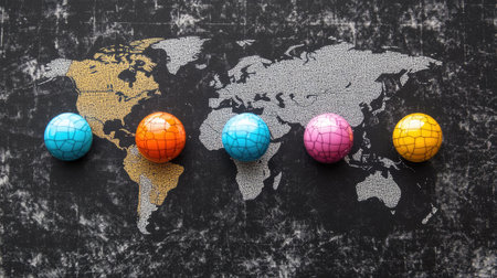 A captivating arrangement of colorful globe spheres on a textured world map, depicting themes of global connections and the spirit of exploration.