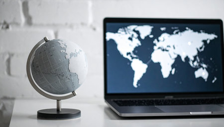 A modern desk setup featuring a laptop displaying a world map alongside a physical globe.