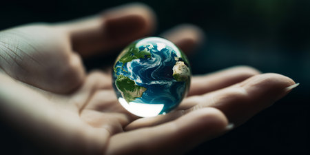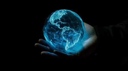 A human hand gently cradles a transparent, glowing blue globe, showcasing illuminated digital continents and intricate network lines across its surface.