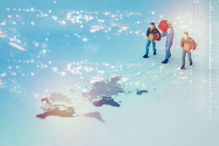 Double exposure image overlay with night lighting cityscape image and miniature people of man carrying a parcel on a map. The concept of worldwide courier service and business of logistics and wholesale