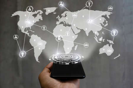 5G. smartphone on hand with global media link connecting on international world map background, digital, internet, communication, networking, business, network connection and technology concept