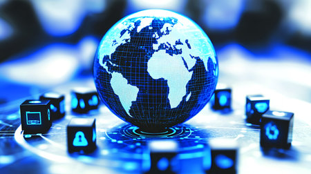 A digital globe surrounded by glowing cubes, representing the interconnectedness of technology.