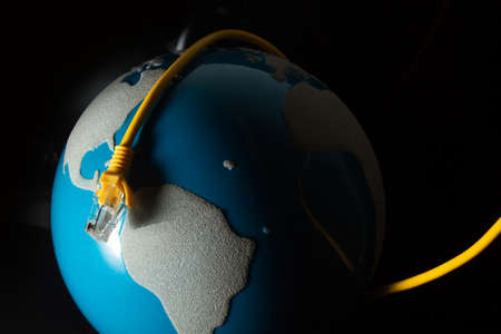 world map globe with internet server online yellow lan wire on black background in technology digital connection with business aroun the world concept