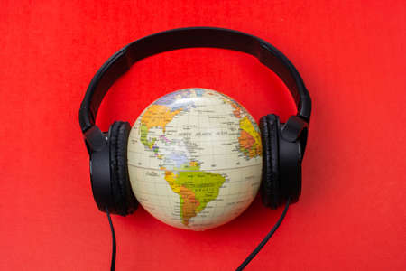 Headset on globe isolated on the red