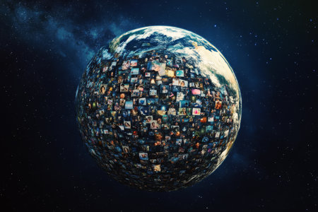 Planet covered by social media photos and videos. Concept of online content consumption. Global network and online communication