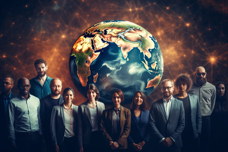 Global business people on a world map background. Concept Global Business, World Map, Networking, Professional Portraits, Diversity