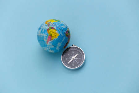 Minimalism travel, adventure. Compass and globe on a blue pastel background. top view.