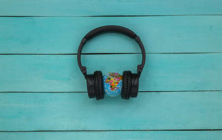 Stereo headphones with a globe on blue wooden background. World Music Day. top view