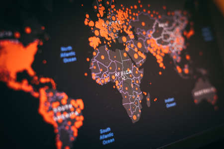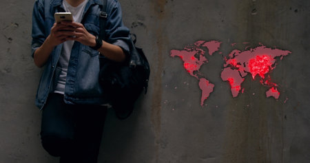 Young man checking smartphone with world map highlighting pandemic hotspots. Technology, connectivity, global, outbreak, communication, analysis