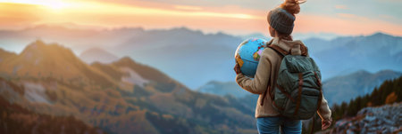 Traveler with a globe in hand overlooking a scenic mountain landscape at sunrise. Adventure and exploration theme.