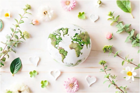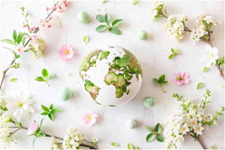 A stunning visual of Earth with a blue textural backdrop encircled by soft green leaves and delicate white flowers
