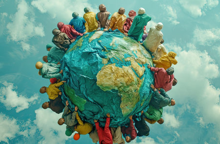 Group of people standing on top of small globe with trees and buildings around it. Generative AI.