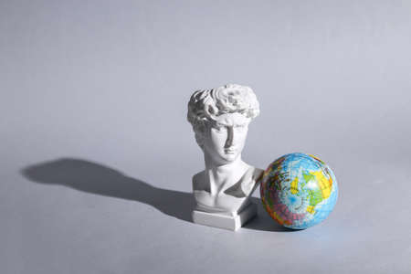 Antique David bust with globe on gray background with shadow. concept pop. Minimal still life. creative travel layout