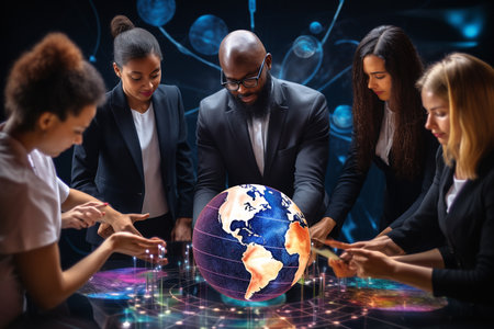 A group of diverse students collaborating around a large holographic globe visualizing opensource data from various urban sectors highlighting community contributions and insights throug