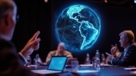 A dynamic hologram of a globe spins in the center of the forum surrounded by participants who are discussing sustainable practices. One attendee gestures toward the hologram while anothe